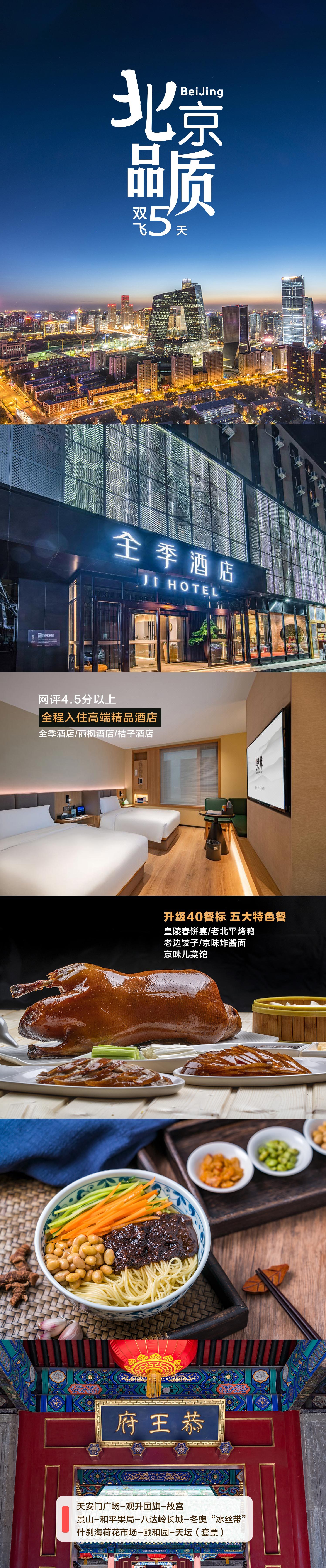 早餐后,前往全世界最大的城市廣場——【天安門廣場】(游覽時間為1小時左右)游覽,后參觀【毛主席紀念堂】(游覽時間為1小時左右)(以上景點為國家公共設施,如遇國家政治活動無法參觀,旅行社不予負責)。前往【故宮】深度游配備無線講解器(又稱紫禁城)(游覽時間3小時左右),故宮是明、清兩代的皇宮,是無與倫比的古代建筑杰作。我社安排的人性化故宮深度游,精心為貴賓們配備了無線講解器,通過佩戴無線耳機,即使在人多聲雜的旺季,您也可以通過導游清晰的講解更加深度地了解紫禁城的歷史,而不再受其他團隊聲音的打擾。深度游慈寧宮前找“庇護”趣味課堂,結合故宮中慈寧宮太后居住的場所,體會明清皇帝孝行天下的傳統思想。尋找那只600年高壽為了皇家子孫綿延,生生不息的小動物。(線路安排:午門--太和門--文華殿--太和殿--保和殿--箭亭--乾清門--慈寧宮--乾清宮--坤寧宮--御花園--神武門結束)。之后前往【景山公園】坐落在北京中軸線上曾是京城制高點的景山萬春亭是觀賞整個紫禁城的最佳地點,在春暖花開的時節公園內到處盛開著迎春花,山桃花,是這個季節打卡的最佳時段。之后前往【王府井和平果局】在王府井百貨大樓里出現了一座“老北京城”,還原了最樸實無華的老北京市井生活。在這里,不僅可以逛老北京胡同,還可以嘗老北京小吃、聽相聲,仿佛穿越到了半個世紀前的北京城。(晚餐自理)之后返回酒店休息。