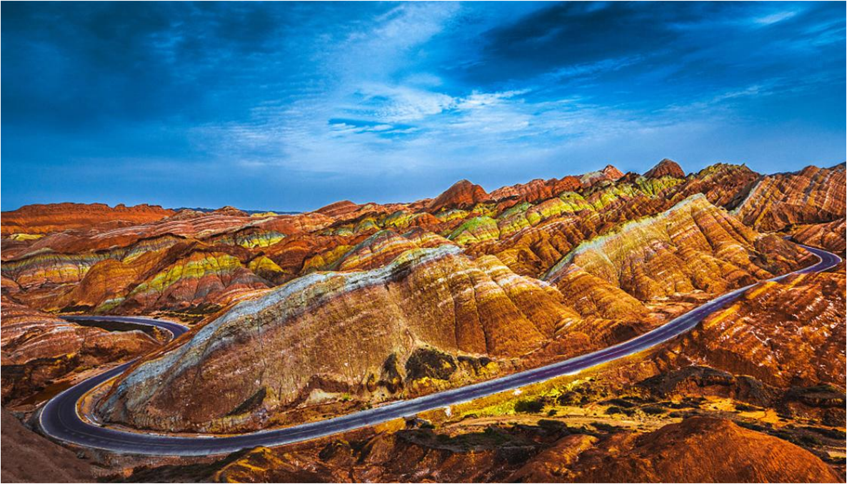 光的照耀下,各處造型奇特的山地丘陵色彩斑斕、氣勢磅礴。