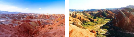 張掖丹霞主要由紅色礫石、砂巖和泥巖組成,游客在景區內能看到數以千計的懸崖、山巒呈現出鮮艷的丹紅色和紅褐色,特別是在陽