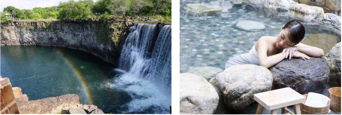【吊水樓瀑布】瀑水飛 瀉直下,浪花四濺,氣勢磅礴。參觀由萬年前火山噴發(fā)形成的玄武巖臺地,深不見 底的黑石潭、回音壁、觀瀑亭等,可在偉