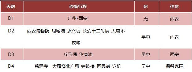 早餐后前往【西安博物院】(周二閉館),西安博物院是西安市的一座集博物館、名勝古跡、城市園林為一體的博物館。以展示的珍貴文物,唐代千年古塔、悠揚的雁塔晨鐘、秀麗的園林景觀而聞名。以西安博物院的中心建筑小雁塔為設計元素,小雁塔是西安博物院收藏的最大文物。館藏陳列以“古都西安”的為總標題,又分為“千年古都”和“帝都萬象”兩部分。中餐品嘗熱騰騰的,傳遞祥和與溫暖的《餃子餐》中餐后參觀世界上規模最大保存最完整的軍事堡—【明城墻】(約1小時),這座雄偉的西安古城墻是明代初年在唐長安城的皇城基礎上建筑起來的,也是西安這座歷史文化名城的重要標志之一,其規模之大,保存之完整為世界少有,在此可領略古色古香的古城風光。游覽非物質文化美食街【永興坊】,這里沒有重復的店面,沒有加盟店,都是西安本土出名的老店或開的分店咸陽過來開的面館,潼關過來做的肉夾饃,陜北橫山燉的羊肉……永興坊地地道道舌尖上的美食,一口吃遍陜西,讓我們一起搭乘吃貨號小火車,在永興坊里開心的“逛吃,逛吃,逛吃……”隨后身著唐裝,讓每一個人重新體驗到一種流動的東方文化精髓。后前往新晉網紅打卡地【長安十二時辰】(參觀約1.5小時左右)長安十二時辰主題街區是以唐市井文化為源點,以網劇《長安十二時辰》IP為主題,以沉浸式體驗為核心,在建筑、軟裝、錢幣、人物、服裝、語言、音樂、故事等領域進行全唐化包裝,同時圍繞深度沉浸式故事體驗,設置配套的餐飲、文創、演藝等業態內容,整體打造集全唐空間游玩、唐風市井體驗、主題沉浸互動、唐樂歌舞演藝、文化社交休閑等為一體的全唐市井文化體驗地。游覽【大唐不夜城】(約1小時)是中國十大高品位文化步行街、西安年·最中國主會場。一個耗資50億打造的新唐人街,整條街由大唐群英譜、貞觀之治、武后行從、霓裳羽衣、雁塔題名、開元盛世等13組大型文化群雕貫穿其中。還有專門為這條街量身打造的璀璨絢爛的景觀燈,結合周圍恢弘大氣的精致仿唐建筑群,以及每隔50米一組不同風格各色駐場樂隊!沉浸其中,拍照不停,興奮不能自拔,宛如夢回盛唐!現已成為來西安旅游必要多次前往的網紅文化街區,在這里還可以偶遇網紅不倒翁小姐姐,與其牽手,一起夢回大唐!用餐后入住酒店休息!!