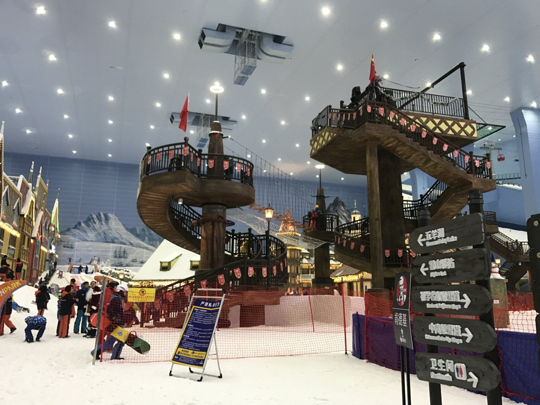 滑雪區域設有適合零基礎的單板練習道、雙板練習道,中級道、2條高級道等5條不同難度的雪道。其中室內雪場少見的兩條立體交叉雪道的設計讓中高級滑雪愛好者感受不一樣雪道變化帶來的樂趣。另外,中級道與雙板練習道通過中段緩沖區域組成了長達460米的超長室內高山滑雪雪道。